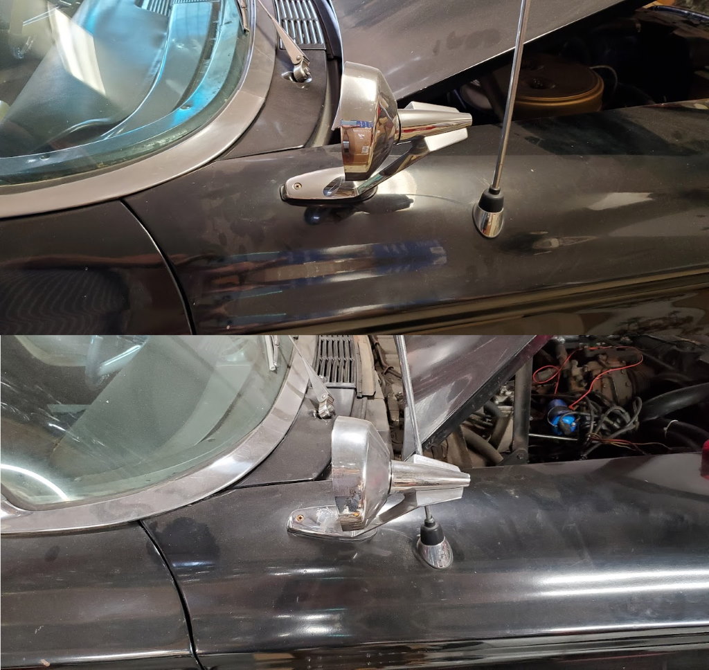 You'll see the manual antennas mounted in different places on the front fender. The dealer was supposed to use a template and it was different if the car had the right mirror. My 60 wagon came with the right mirror and the antenna is in the wrong place and hits the mirror. My 300F didn't come mirrors but the dealer installed them and the antenna.