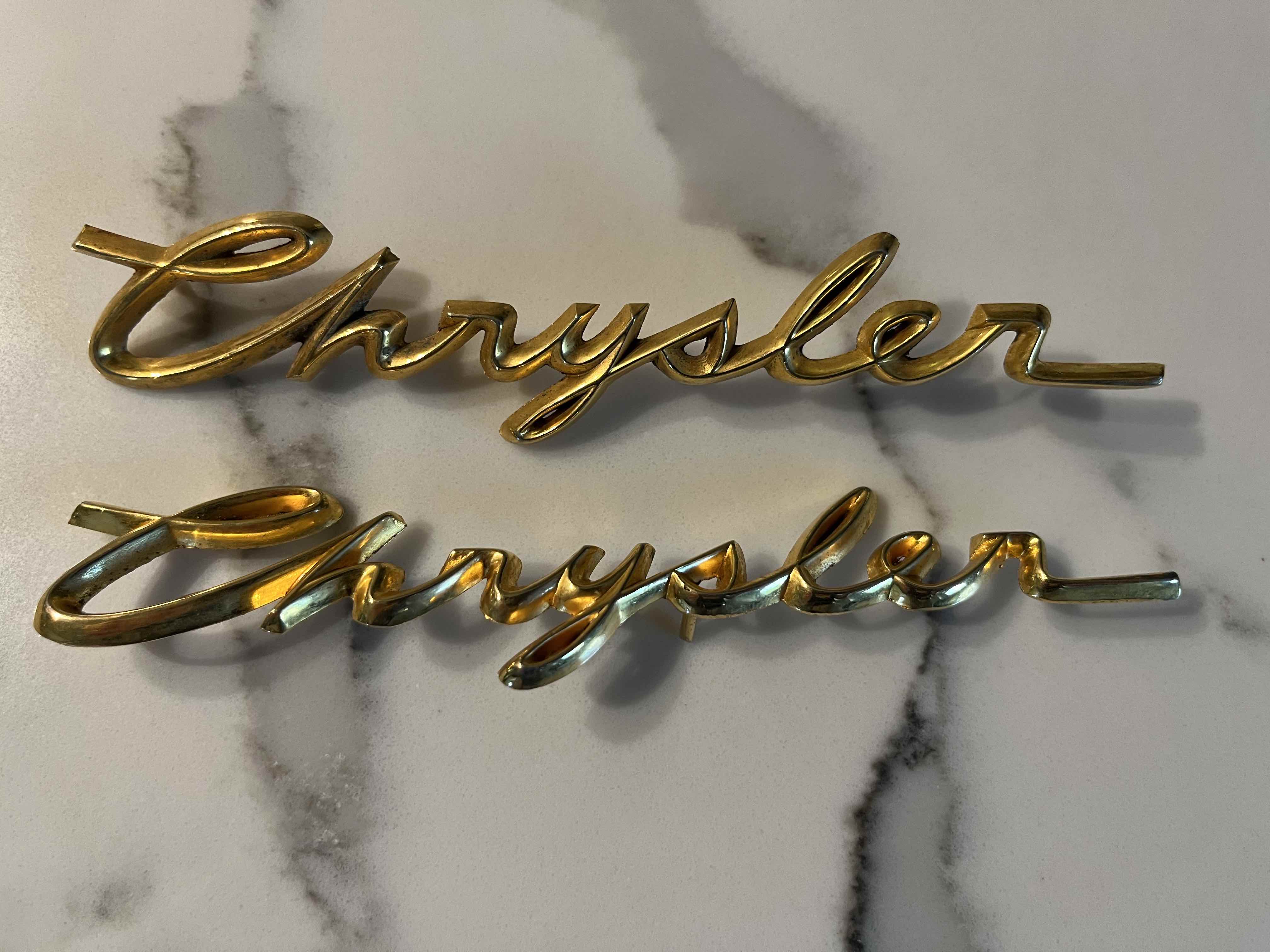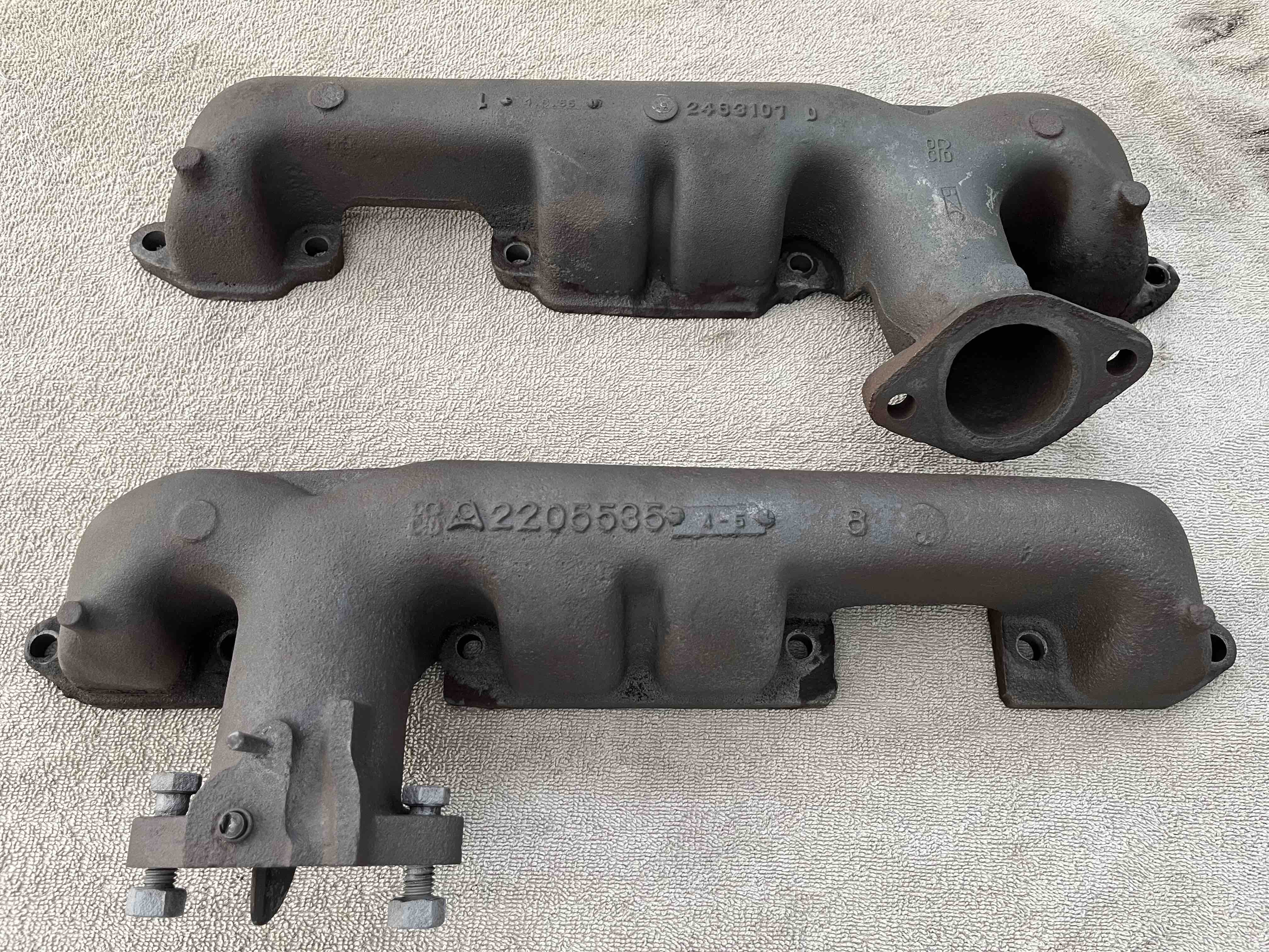 My journey to Iola earlier this month included a Chrysler treasure hunt and sourcing various parts. I have two gold "Chrysler" scripts and exhaust manifolds for a 1965 Chrysler 413 - date coded April 1965. The Chrysler scripts are missing some but not all posts (delicate) but could be fixed - not sure if they're for the hood or glove box door of a late 50s/early 60s car. The exhaust manifolds cleaned up nicely with a quick blast in my booth, no cracks or broken ears.