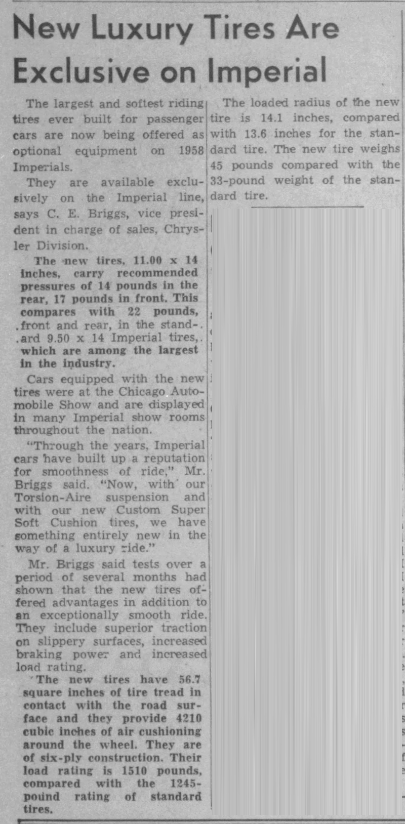 Crazy big tire. Looks like they were made as an option on the 1958 Imperial. See attached.. I wonder what the total diameter was? Must have looked weird at the time. Also found a bonus weird tire thing. Check out the Firestone Perma Spare. We have donut tires now but this is more a pizza.