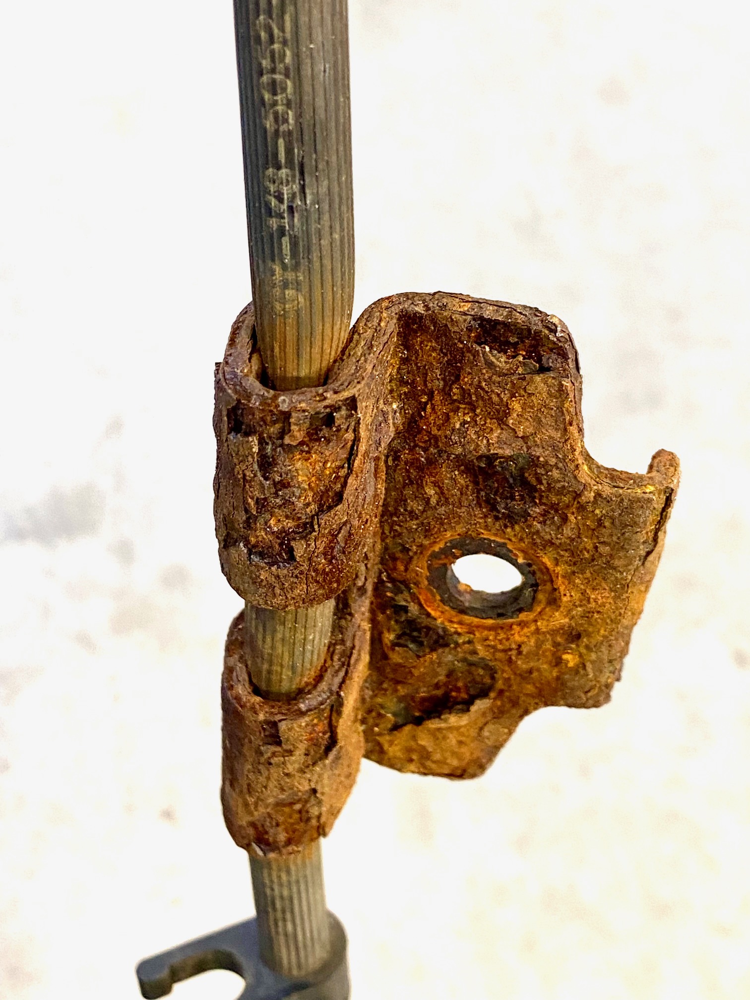 regarding issue described previously with crushed brake hose , look carefully at end view of clamp on the hose . . You can see hose is flattened . This more or less prevents caliper release. And comes on slowly , hot rotors etc till one day it may burn up as you are going 80 . really should be recalled .