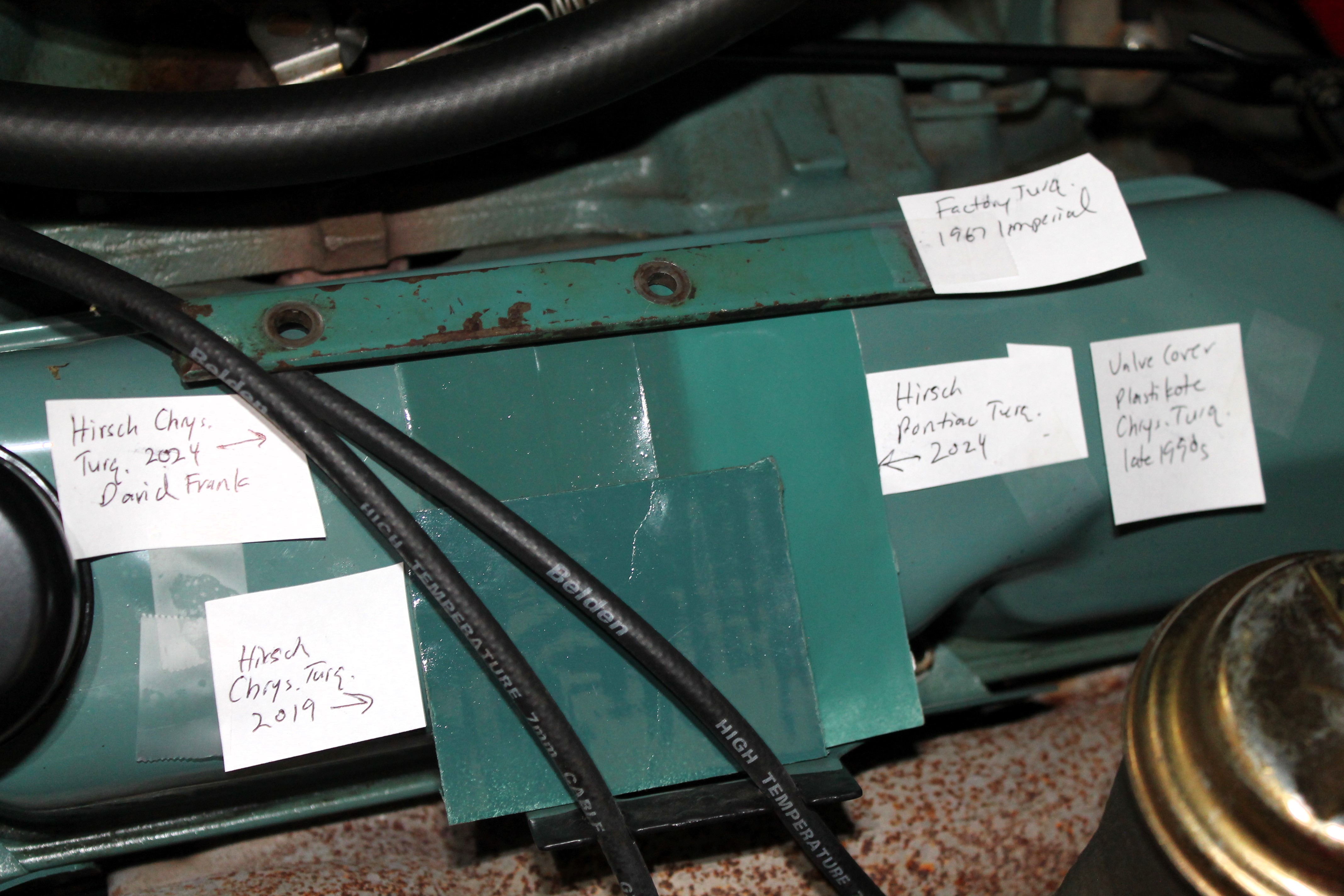 Conclusions: The original recommended match, back in the day, was the Plastikote Chrysler Turq, which is no longer available. Believe it or not, we found the best match with 1957-58 Pontiac Turquoise from Bill Hirsch. It makes no sense, but multiple eyeballs confirmed this. At the Omaha meet, I gave the samples to Mark Obermann, and he compared them to the Turq engine paint reference sample from Chrysler used for judging - which has been closely guarded all these years in the executive washroom at Funk & Wagnalls. Mark agreed - Pontiac Turq was the best match (not perfect, but the closest).