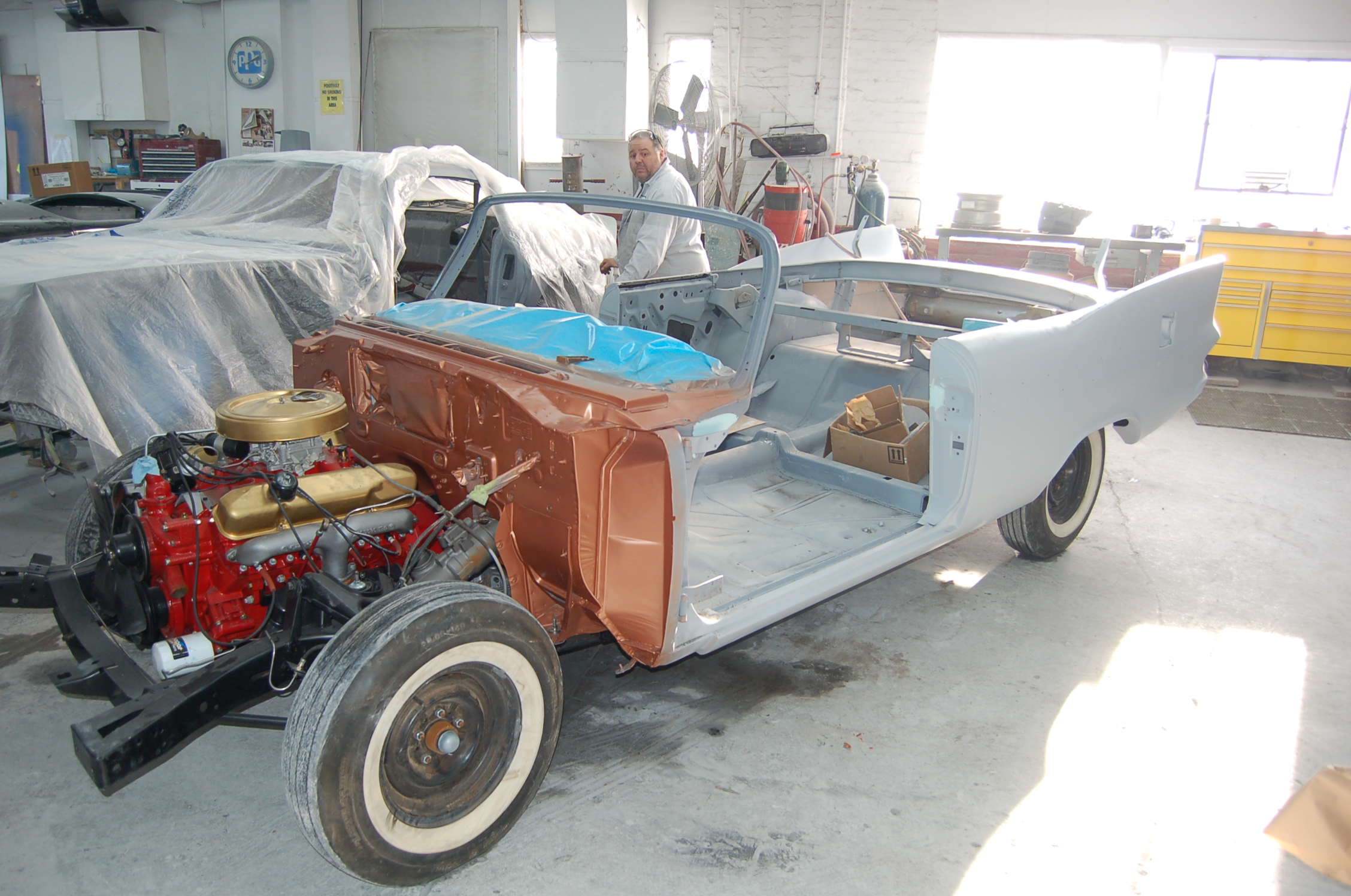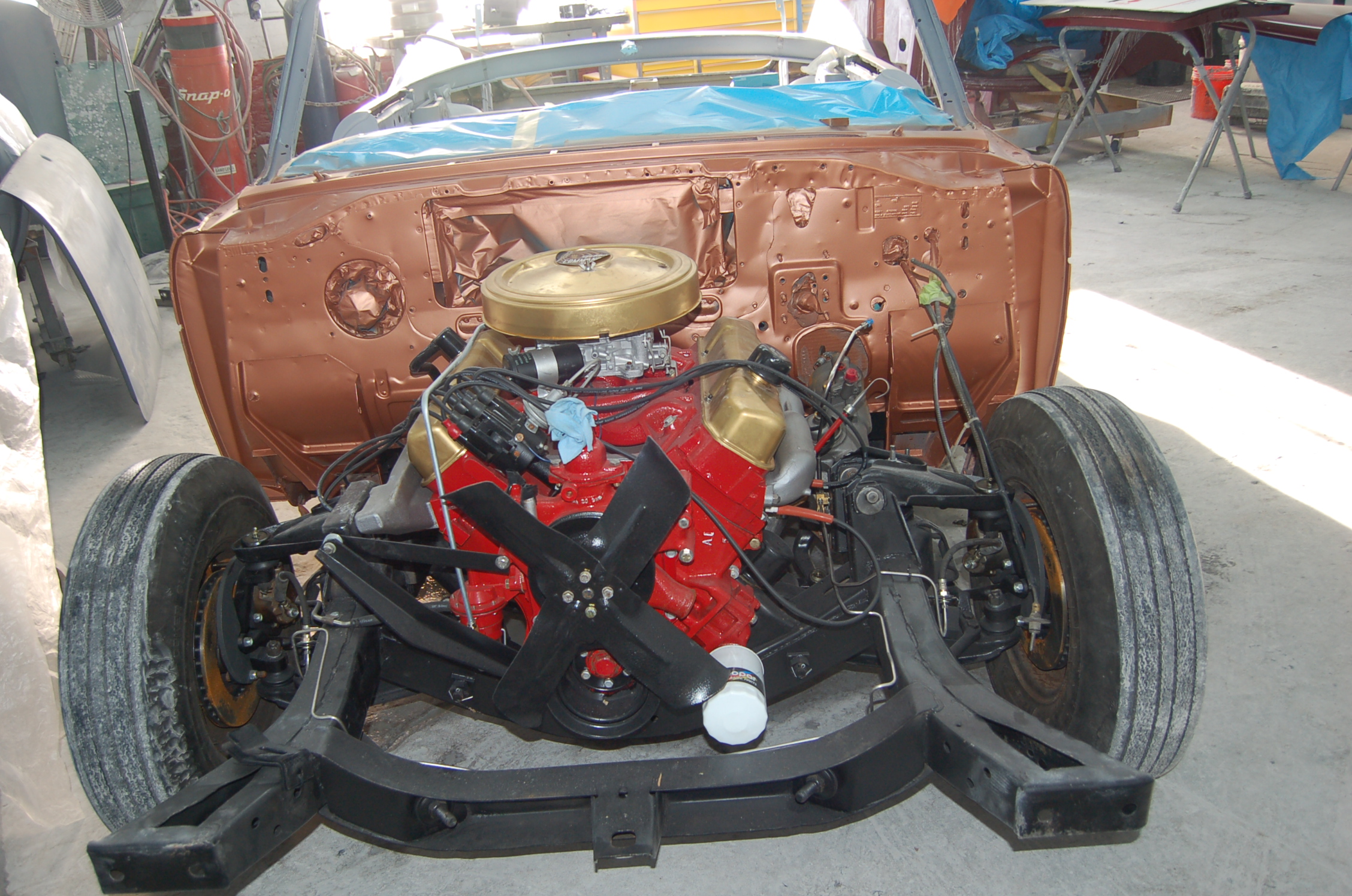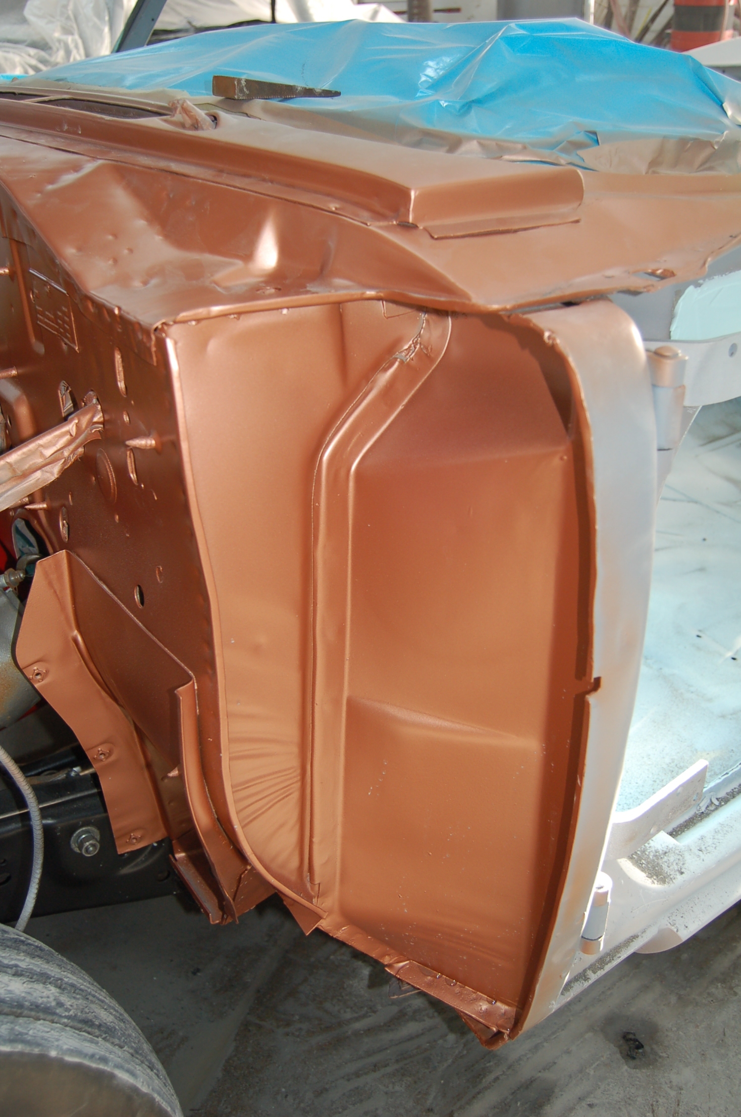 Happy Holidays to the Group My Christmas present came early this year. The body was mounted back on the frame this week. Everything came back together nicely, without any extra shimming. I am still looking for, 1 Cup Shim ,that goes between the frame and the body, if anybody has a spare, please advise. I could use some help identifying those Areas that need to be primed or some other color except for the body color. Any comments would be appreciated. Also I do not intend to Clearcoat the firewall, I'm going to leave it in a semi gloss condition. Is that correct? Thanks in advance to all. Cheers, Mark Evans