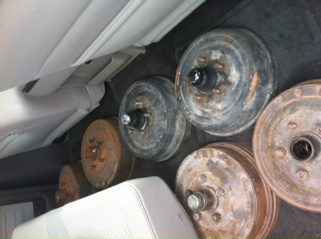 Jackpot. The engineer brought me 3 pairs of drums with the hubs. Came off a 65 I believe but they look exactly like mine especially the black ones. I'm bout to check and see if bearings are the same. He believes that the hubs and drums in 11in were the same thru 67. Here's a pic! Looks like it worked out after all!
