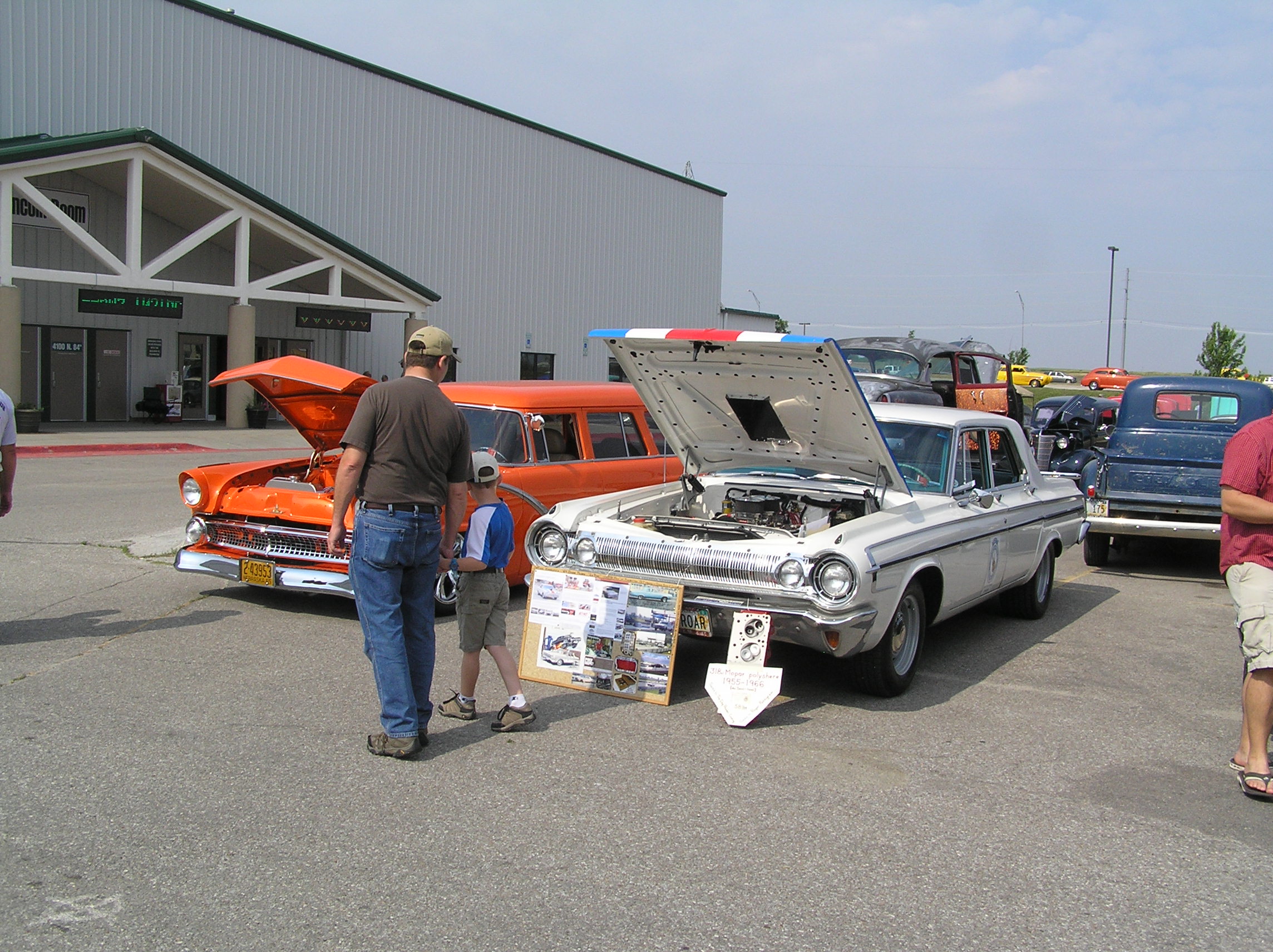 LeRoar made it to the Hot Rod Nationals in Lincoln, Ne on Sat.. It ran very well and  despite the hot weather I only saw the t-stat open once as I was watching the gauge. It got up to 180deg that one time. Mostly it ran around 150deg! I may need to install a fire pit to warm it up. The weather hit 96deg so it sure wasn't cold. I even let it idle about a half hour the day before and it still stayed plenty cool. I parked next to a very nice 55 Ford wagon the first day and the next day a 2010 Mr Norm's HemiCuda parked next to me. I know it's a Challenger convert. It did say Challenger/Cuda.
