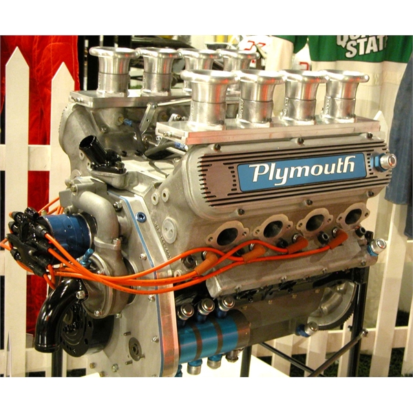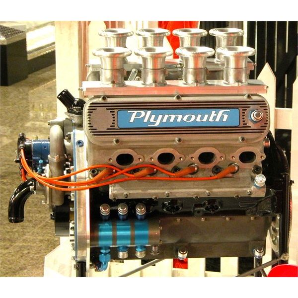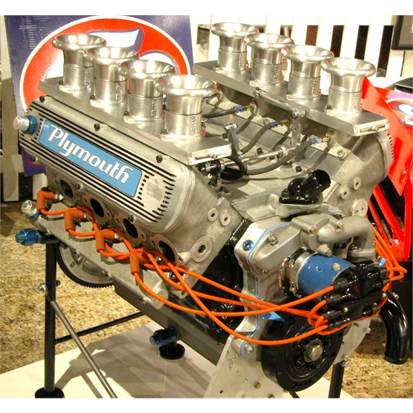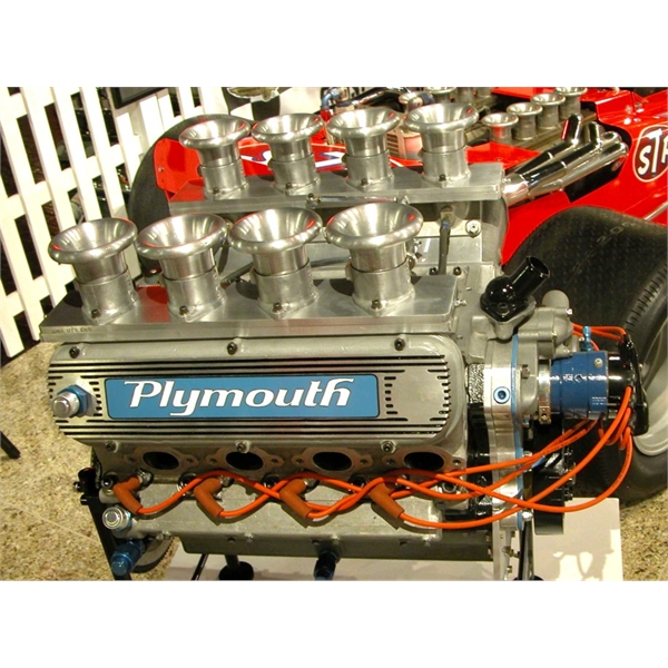 Mystery solved...This is a Double Overhead Cam Plymouth 318 V8 (finished at 327 CID), built by Harry Weslake in 1969 for Andy Granatelli's Indy car. The engine won the Dover 200 and now sits in the Museum Of American Speed, Lincoln, Nebraska.