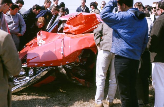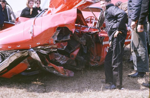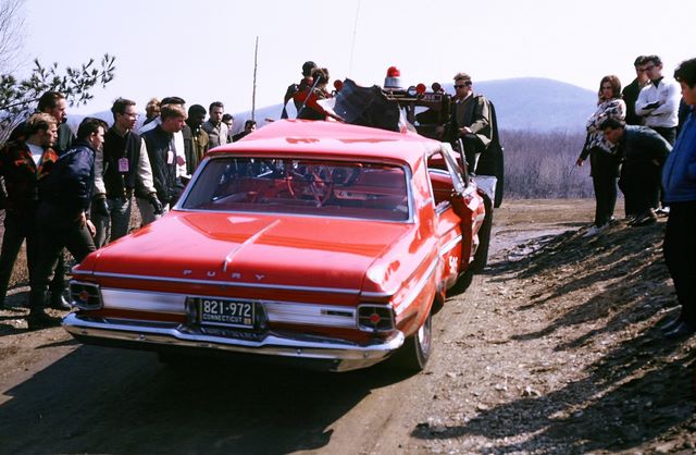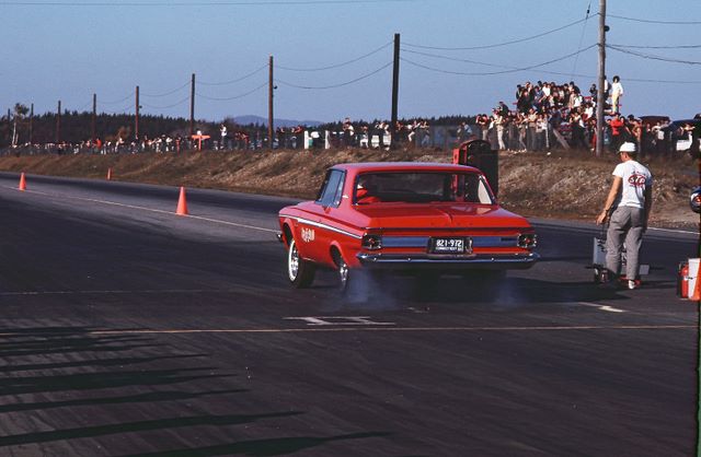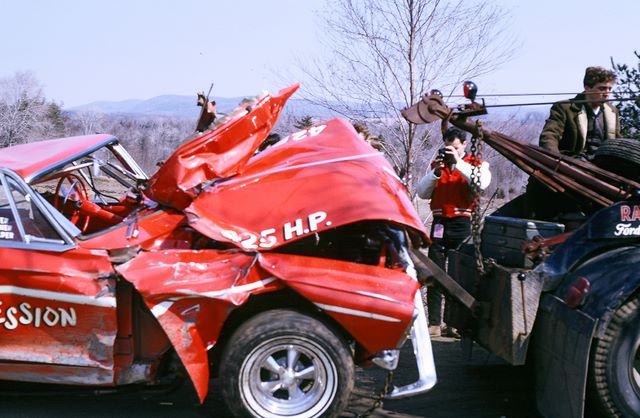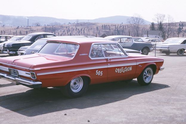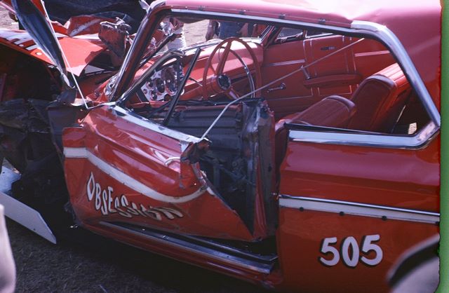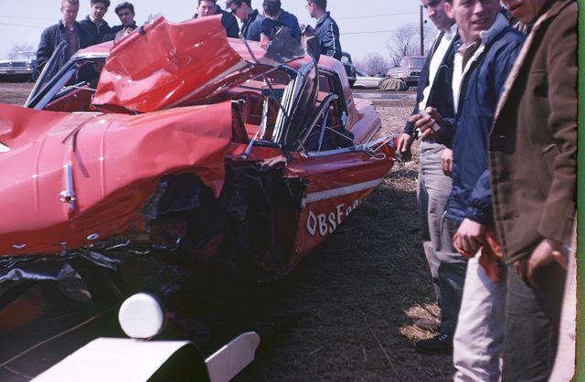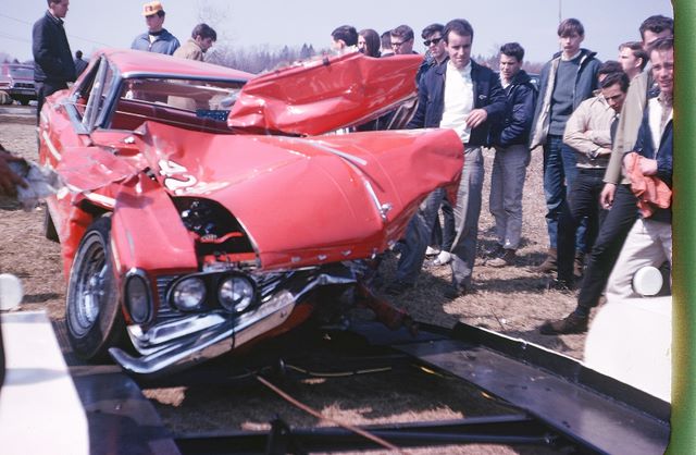 Another sad wreck at Dover was Hank Thayler's 63' Plymouth Fury 426 max wedge Obsession. The impact says it all and he came back later with a 63' Belvedere Obsession II.