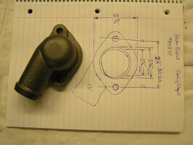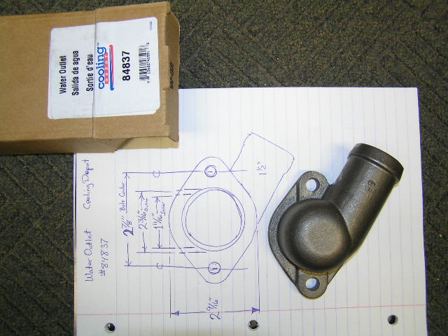 I got the housing from Summit and it is too small??? It's a Summit # FSS-84837 and is a Four Seasons from China. (Go figure) I'm out about $19 total. I would've thought about all the housings were the same in size but vary in hose position. Not so apparently. Maybe this is for a Yugo. It is listed as a "stock" unit. The bolt centers are 2&7/8", the hose fitting is 1&1/2" and the inner portion of the t-stat opening is 1&11/16" while the outer portion is 2&3/16".