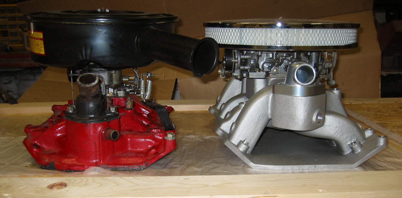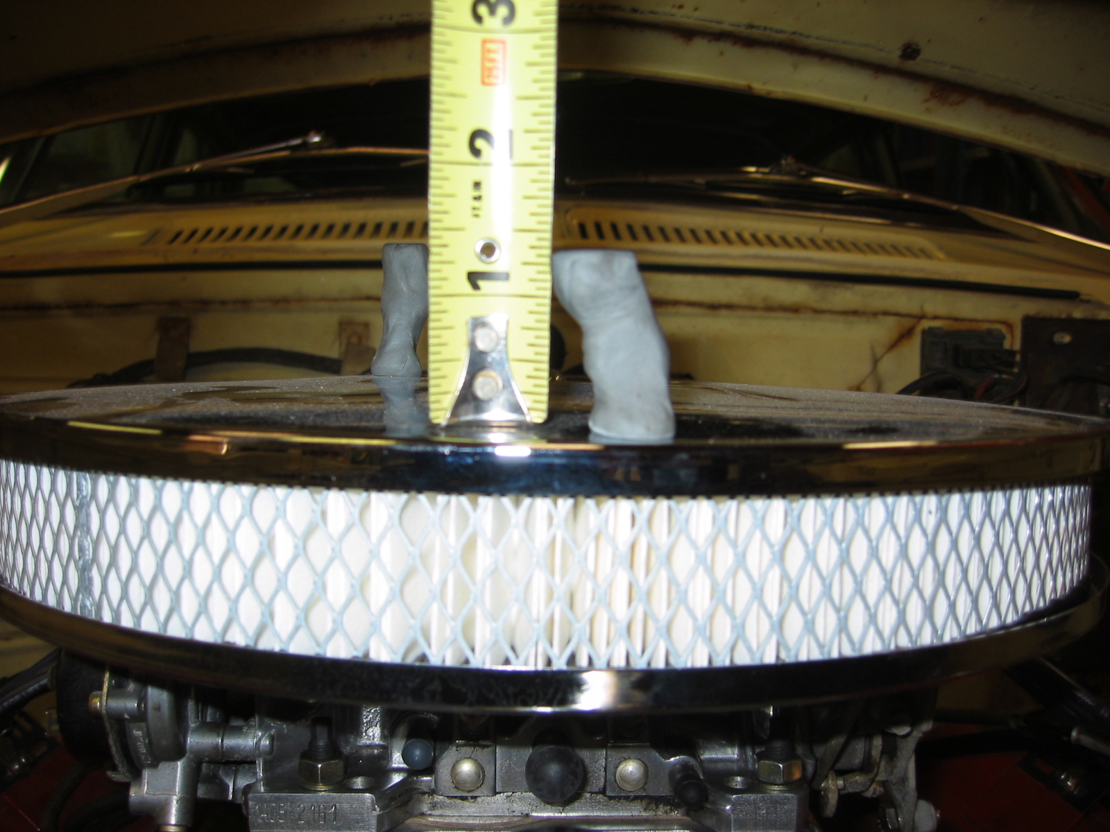 the original 2 bbl air cleaner actually tilts forward. This is with an Edelbrock 1406 and Mr Gasket 4339 air cleaner. I am sure there are other combo’s that will work, thicker air cleaners with more drop over a manual