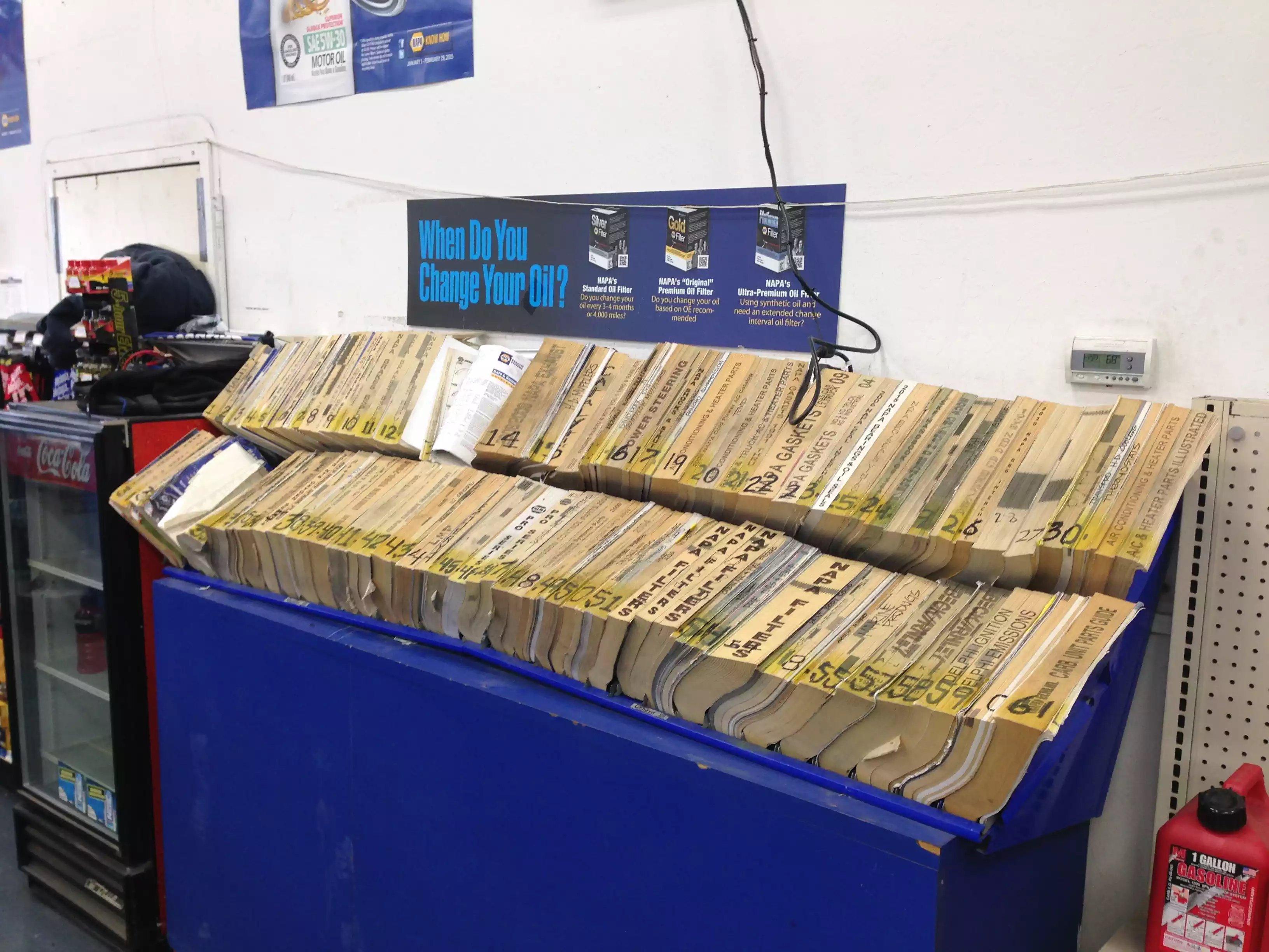 Here's a photo of the paper catalogs behind the counter of a NAPA I recently visited in Sacramento, CA. Let's all hope NAPA stays in business.