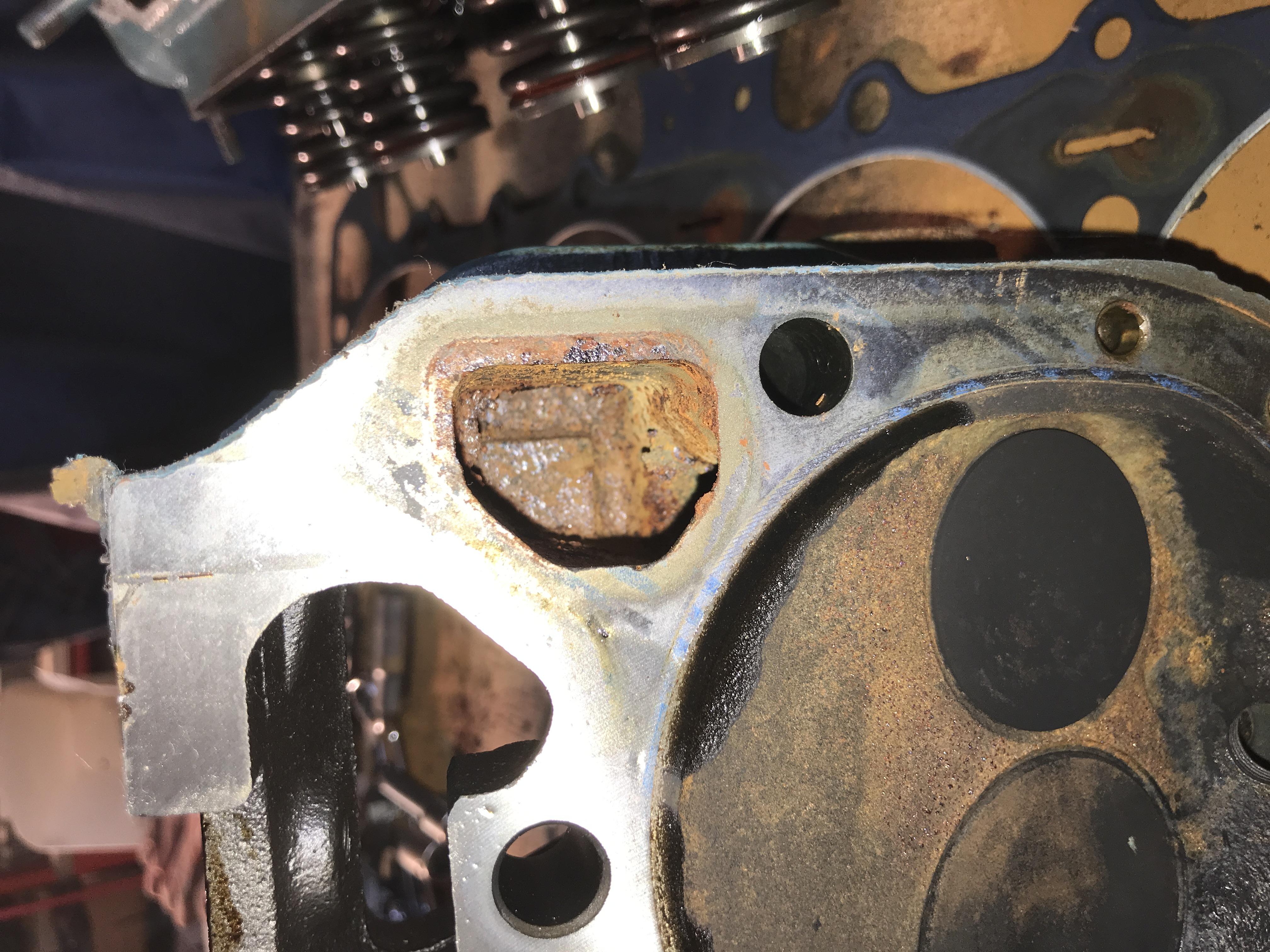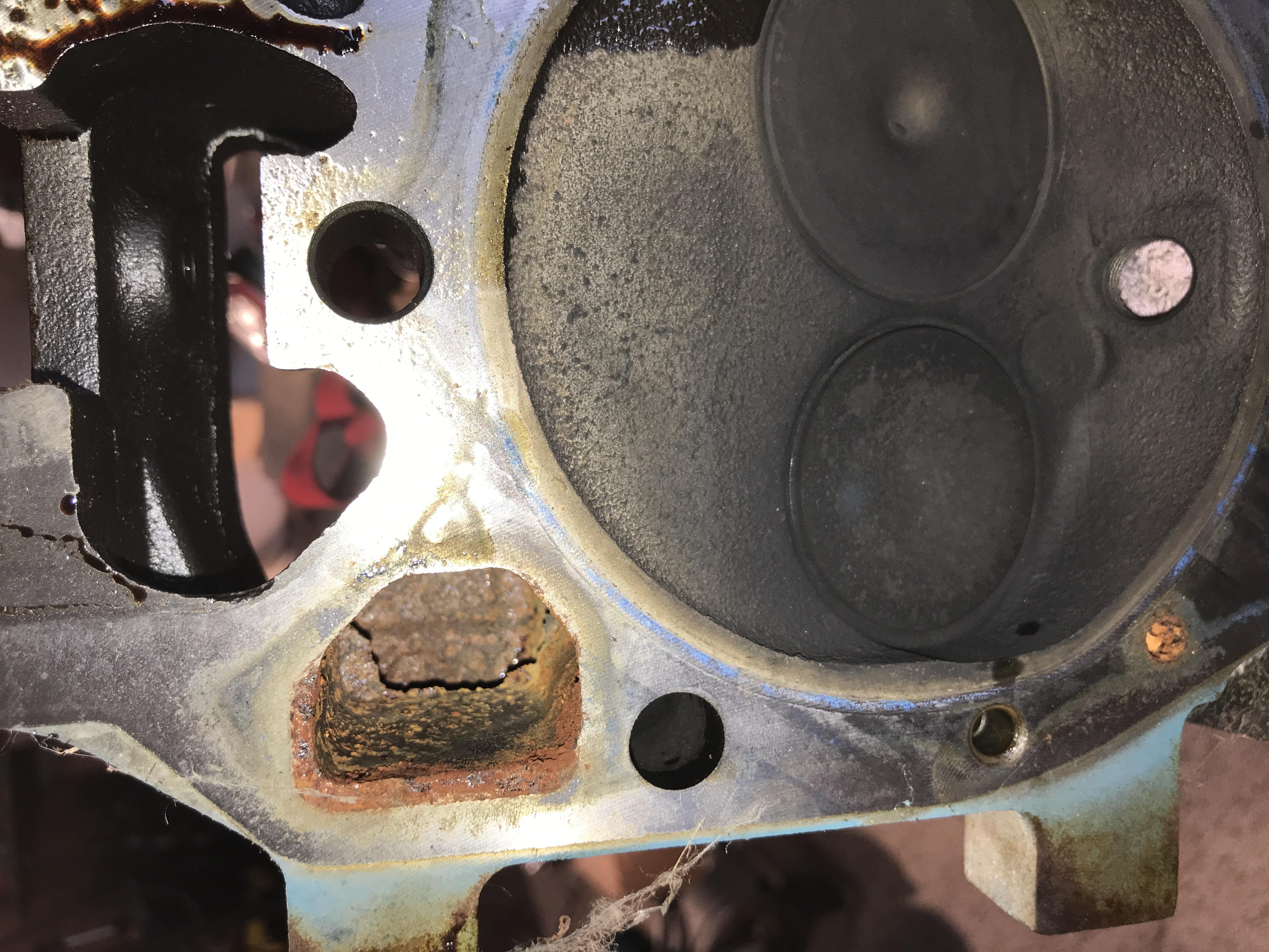 Gang,Quick update on my rusted freeze plugs issue I posted yesterday (thanks for your responses). We pulled out the engine, removed the manifold / heads / camshaft to get a real good look at everything. Luckily, the rust was contained to just the water jacket....but boy howdy, is it every rusty . When we pulled the 6 side freeze plugs, there was probably 1/2 inch of "rust dust" around each plug hole. Some of that I'm sure was from the plugs themselves, but some must have been higher in the block. The coolant holes in the heads are also pretty rusty. See attached photos if you're morbidly curious.Here's my planned next steps, please let me know if I'm smoking crack or if you have other suggestions:1. I'm going to vacuum out all the rust dust I can reach, and then use wire & bottle brushes to try and loosen up as much rust as I can - I might even put a gun-cleaning brush on a drill to get the small holes. I'll vacuum at the same time and take care to keep dust out of the engine guts.2. After a good vacuum job, I'll seal up the engine top and then blow a lot of compressed air through the water jacket.3. I'll take the engine outside and try to run some plain water and perhaps a little vineager through the coolant areas for a first initial flush - again, taking care not to get junk in the top of the engine.4. After installing BRASS freeze plugs, we'll reassemble & reinstall the engine. We'll either use an older "sacrificial" radiator, or just bypass the radiator. We'll fill it full of some type of block flush chemical (like Thermocool) and let it cycle through for a few minutes, before shutting it off and leaving it for a day or two.5. We'll drain the fluid, probably repeat the flush step until it looks clean, before putting the real radiator & coolant back in.6. We'll check the coolant again after a few weeks.Here's the moral of the story and a lesson learned for you: don't leave an engine block empty and assume it is dry, and leave it outside for 5 years sealed up except for the radiator cap!
