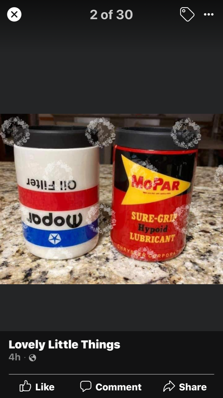 I found these cupholders on Facebook today have both the new and old Mopar emblems Mark -- -- -- Please address private email -- email of interest to only one person -- directly to that person. That is, email your parts/car transactions and negotiations, as well as other personal messages, only to the intended recipient. Do not just press "reply" and send your email to everyone using the general '62-'65 Clubhouse public email address. This practice will protect your privacy, reduce the total volume of mail and fine-tune the content signal to Mopar topic. Thanks! 1962 to 1965 Mopar Clubhouse Discussion Guidelines: http://www.1962to1965mopar.ornocar.org/mletiq.html and http://www.1962to1965mopar.ornocar.com/general_disclaimer.html. -- You received this message because you are subscribed to the Google Groups "The 1962 to 1965 Mopar Mail List Clubhouse" group. http://groups.google.com/group/1962to1965mopars?hl=en. --- You received this message because you are subscribed to the Google Groups "The 1962 to 1965 Mopar Mail List Clubhouse" group. To unsubscribe from this group and stop receiving emails from it, send an email to 1962to1965mopars+unsubscribe@xxxxxxxxxxxxxxxx. To view this discussion on the web visit https://groups.google.com/d/msgid/1962to1965mopars/AC05ED21-9B3F-48C8-9F25-F1AEA49FFF71%40aol.com.